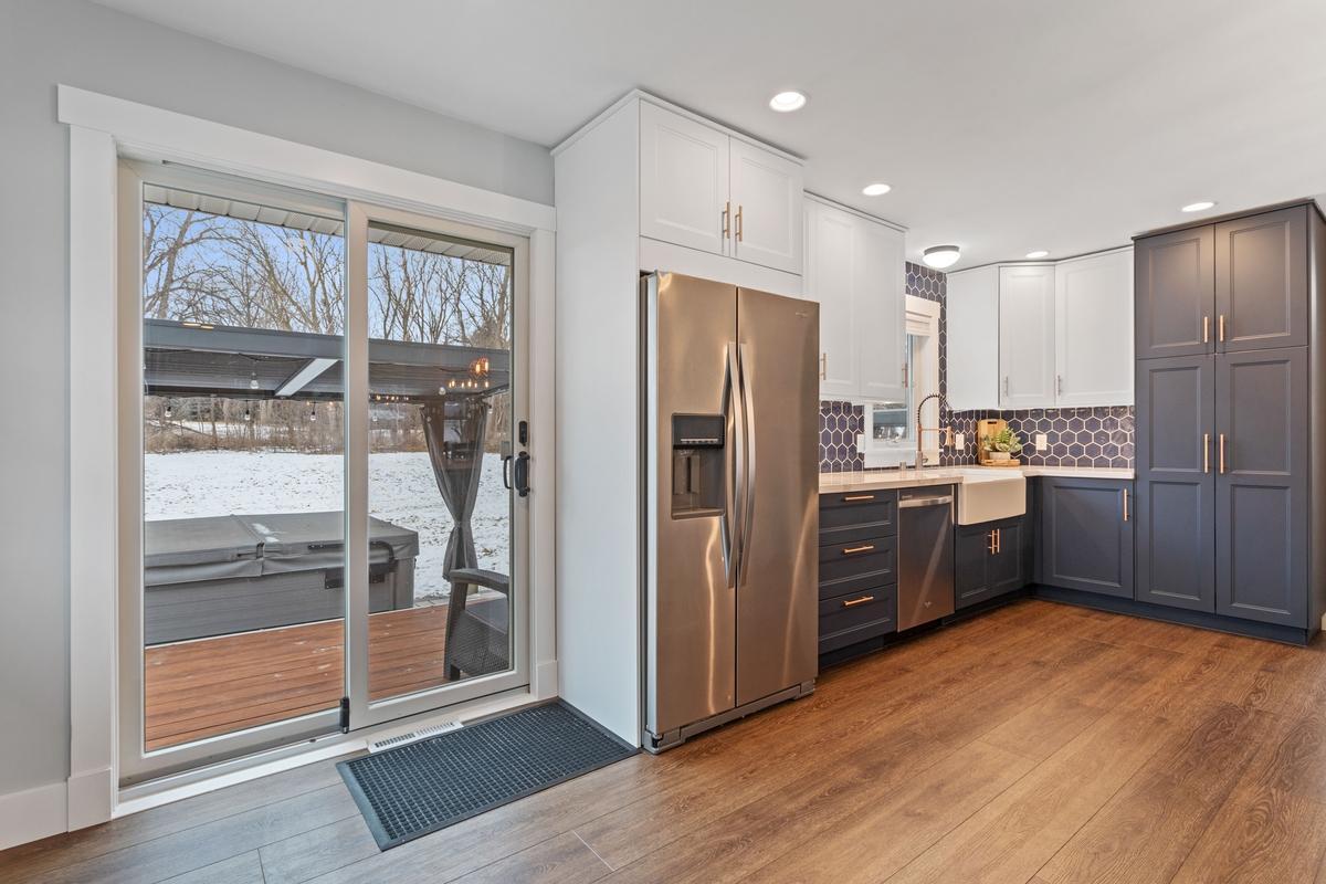 This beautiful newly remodeled home features an open-concept living area with a gorgeous kitchen offering dual-tone cabinetry, copper handles, elegant Silestone quartz countertops, premium hexagon tiles backsplash, farmhouse sink, and stainless steel appliances, including a ceramic cooktop and side-by-side refrigerator. Enjoy luxury vinyl plank flooring, white trim, modern light fixtures, and new high-quality Anderson windows. Newer mechanical upgrades include water heater, washer/dryer, softener, A/C, and furnace. The main level leads to an expansive backyard patio featuring multi-tone concrete pavers, composite decking, and pergolas, creating the ideal space for outdoor entertaining. Other highlights include a newer architectural shingle roof and an insulated garage. This home is a must-see!